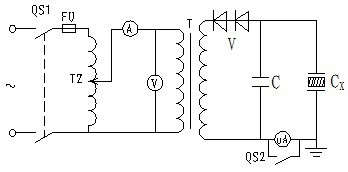 直流耐壓及泄漏電流試驗(yàn)設(shè)備,一般由調(diào)壓器、試驗(yàn)變壓器、半導(dǎo)體硅堆組成的半波整流電路和測(cè)量?jī)x表構(gòu)成,試驗(yàn)接線(xiàn)如圖1-4所示。